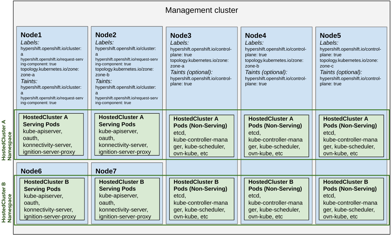 HyperShift enables implementing the strategy to colocate and isolate pods for Hosted Clusters. As a management cluster operator you can leverage the following Node labels and taints: