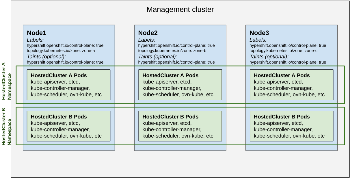 - The rest of the hosted cluster’s control plane pods can co-exist with other clusters’ control plane pods running on shared nodes.